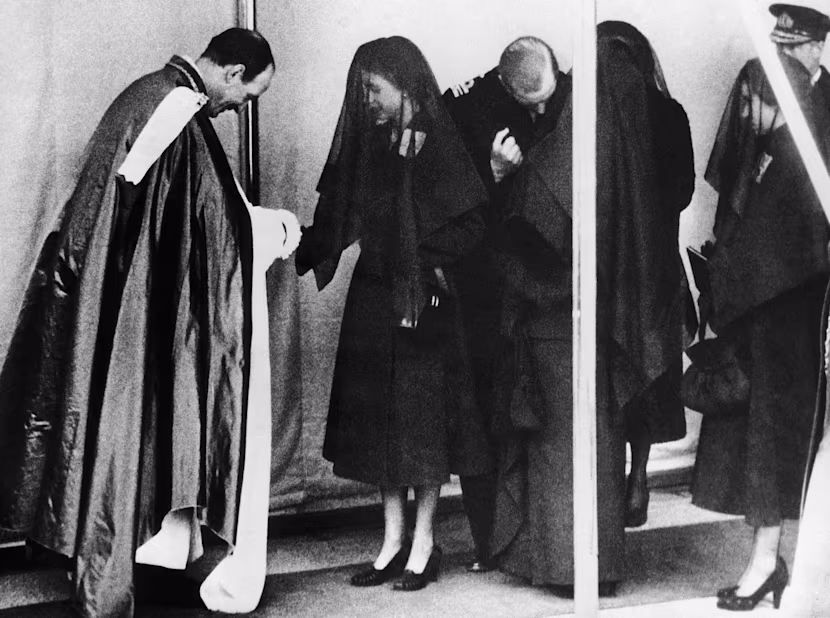 Queen Elizabeth II shakes hands with the Dean of Windsor after the funeral service for her father. Her Majesty and her sister Princess Margaret are wearing their George VI Family Order badges.